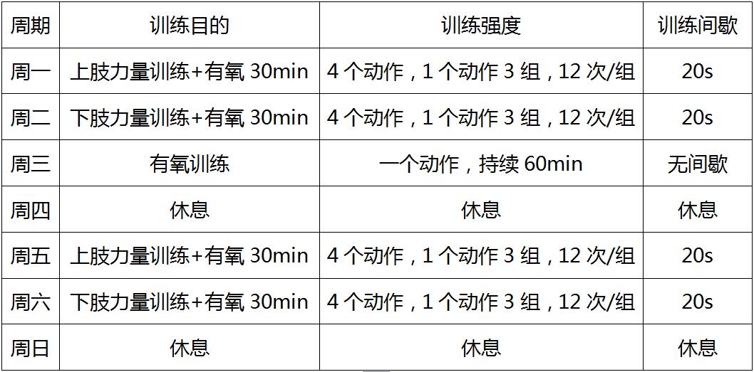 注意事項:運動前要熱身,運動后要進行放松,訓練量和強度由小到大進行,防止運動損傷。訓練后45min內攝入一定量的食物最佳。