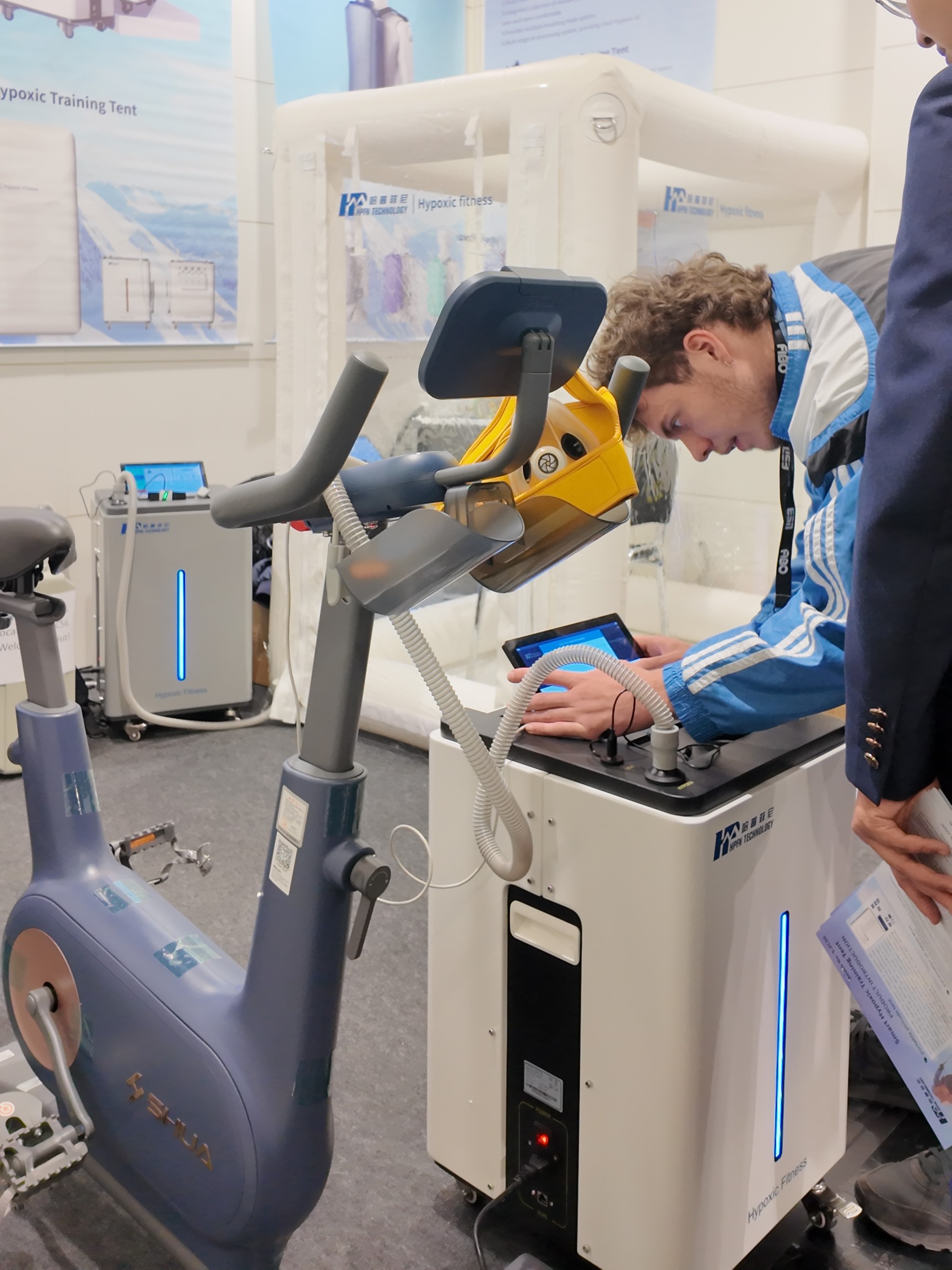 此次展會上,哈普菲尼健身科技有限公司展示了一系列自主研發(fā)的低氧健身設(shè)備。其中,最新款的智能低氧訓(xùn)練帳篷(Smart Hypoxic Training Tent)備受矚目。該帳篷采用了先進(jìn)的智能控制系統(tǒng),能夠精準(zhǔn)模擬不同海拔高度的低氧環(huán)境,從輕度低氧到中度低氧,滿足不同用戶的訓(xùn)練需求。同時,帳篷內(nèi)部配備了舒適的運(yùn)動設(shè)施,如跑步機(jī)、健身自行車等,用戶可以在艙內(nèi)進(jìn)行各種有氧運(yùn)動,享受低氧環(huán)境帶來的獨(dú)特健身體驗,是團(tuán)隊訓(xùn)練與個性化健身的理想之選。
