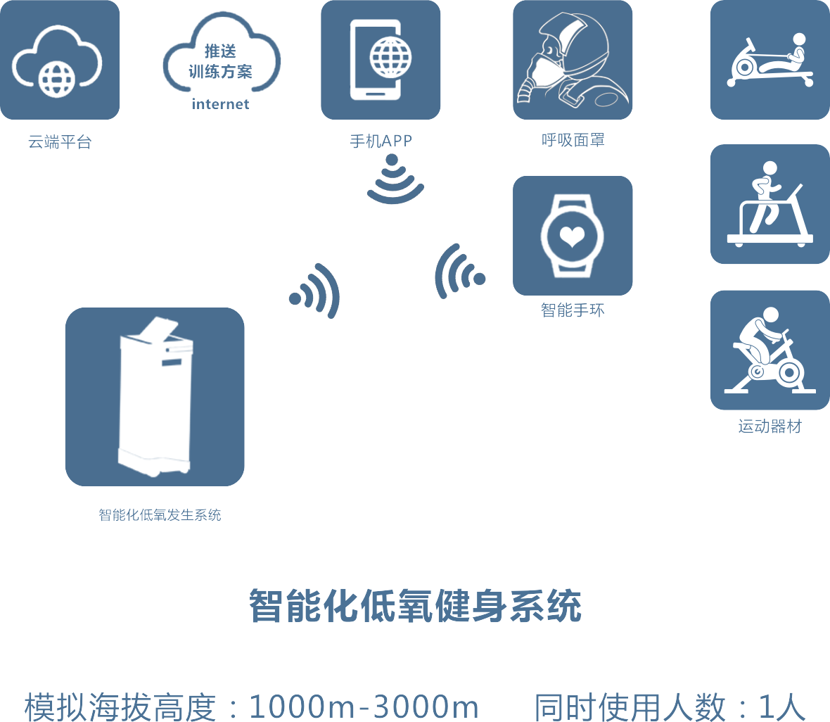 國內(nèi)唯一通過國家權(quán)威CMA檢測認定的低氧健身設(shè)備;用人工智能方法使運動健身時呼吸的氣體氧含量低于標準大氣壓下氧含量21%,以增加人體對氧的利用率,提高有氧能力;實時監(jiān)測運動健身生理參數(shù)等功能,結(jié)合適度運動,實現(xiàn)強化心肺功能、加速燃脂、優(yōu)化血液、提高耐受力及肌力的作用。
